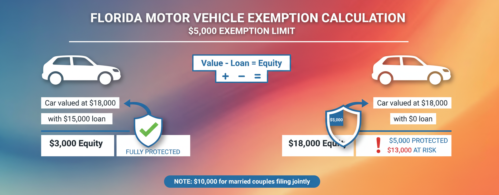Yes, Florida protects up to $5,000 in vehicle equity. Your equity is the car's current market value minus any loan balance. A $18,000 car with a $15,000 loan has only $3,000 in equity, which is fully protected. Married couples filing jointly can stack exemptions to protect up to $10,000 in one vehicle.